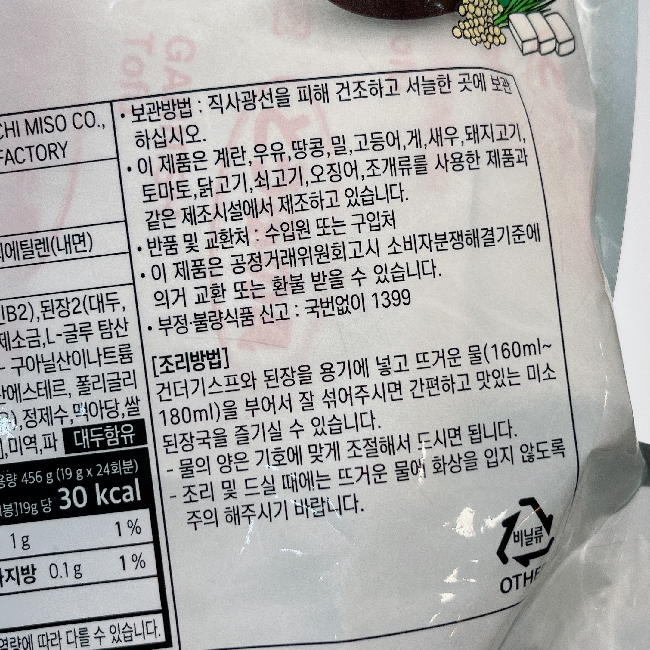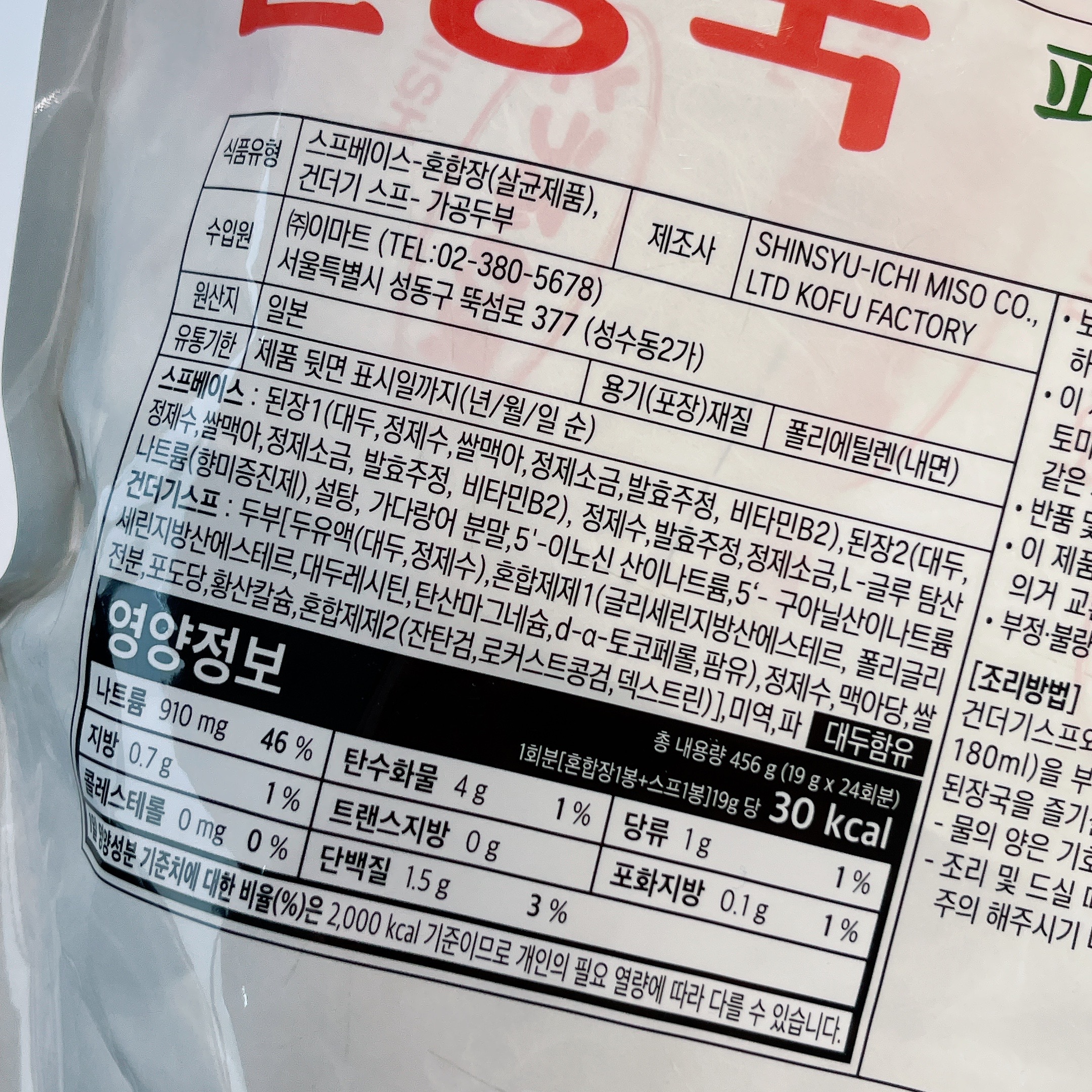 식품 상세 정보에 뭔가 엄청 많이 쓰여있는 것 같지만 사실상 된장이랑 약간의 첨가물, 그리고 건더기 수프는 말린 두부와 미역, 파 정도라고 생각되어(?) 그냥 마음 편하게 먹기로 합니다.