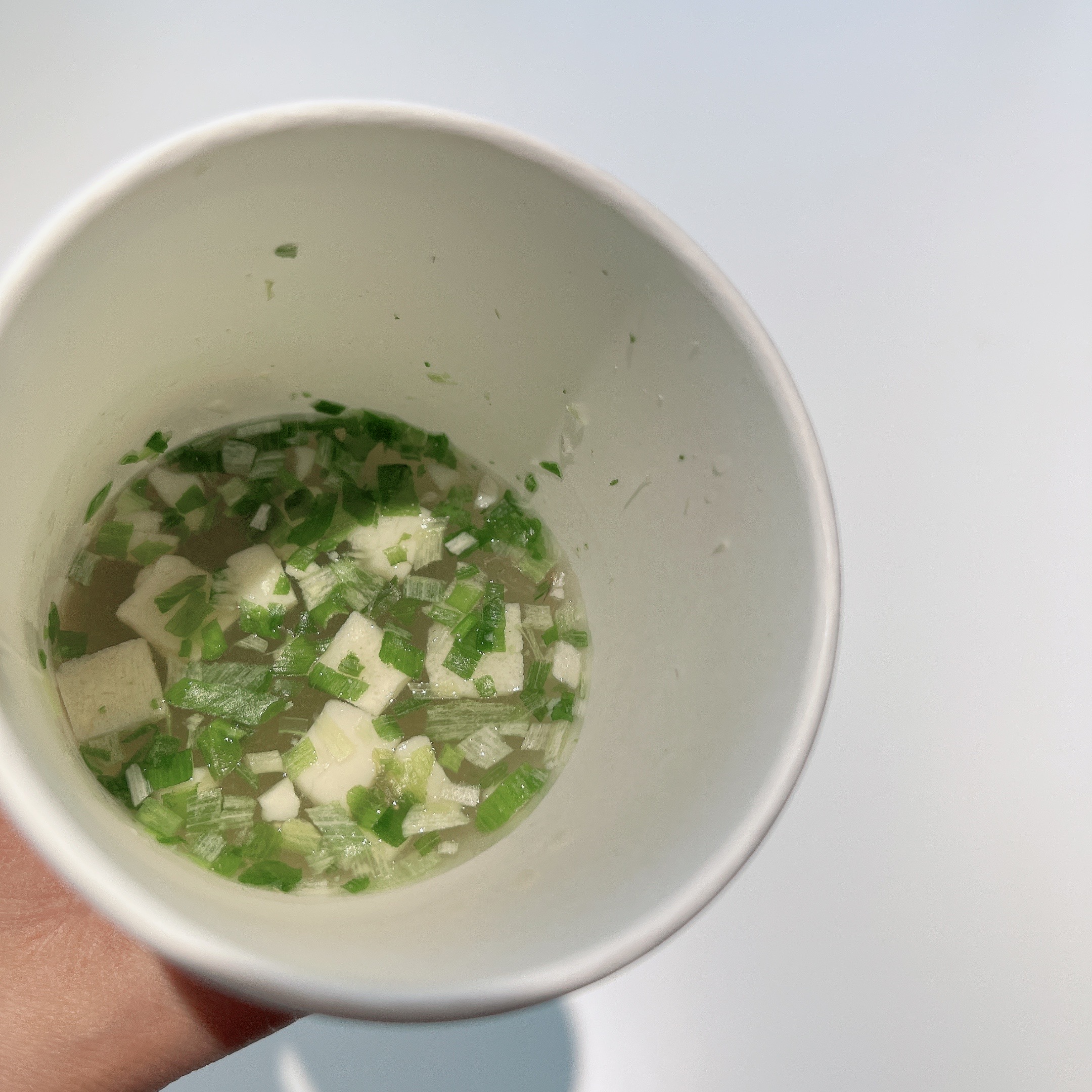 마땅히 국그릇이 없어서 종이컵에 만들어서 먹어봤는데요, 일반 카페에서 주문하는 커피 사이즈 컵의 절반정도 물을 붓고 된장 수프와 건더기 수프를 넣고 보니 이렇게 두부와 파 건더기가 푸짐하게 들어있더라고요. 이 상태에서 숟가락으로 살짝 휘휘 저어주면 미소 된장이 풀어지면서 순식간에 근사한 미소 된장국이 되더라고요! 컵라면 보다 더 빨리 먹을 수 있는 초간단 음식이었습니다. 미소 된장국 안에 미역도 넉넉하게 들어있어서 식감도 좋고 풍미도 좋았어요.