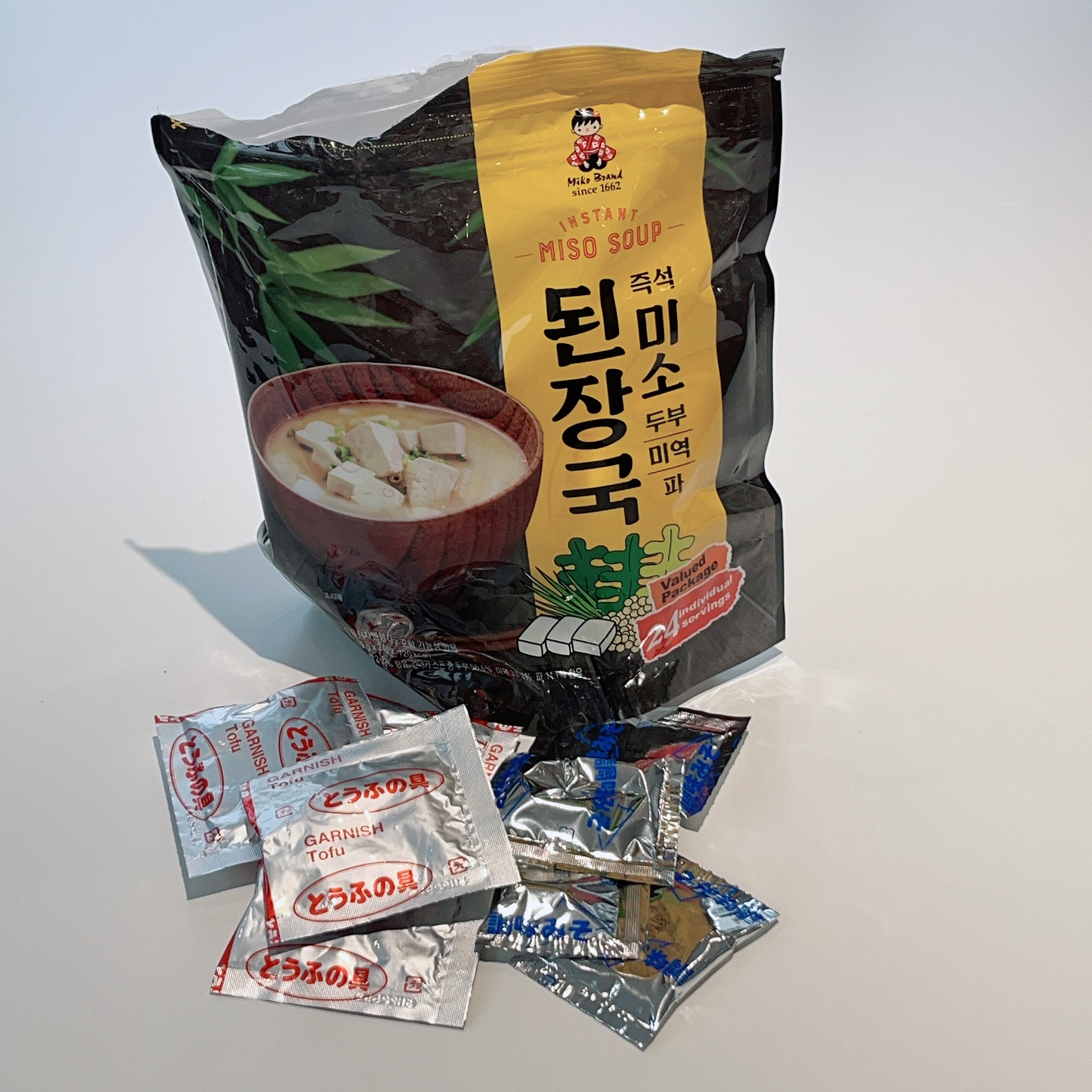 건더기 수프와 된장 수프를 각각 1개씩 꺼내어 용기에 넣고 뜨거운 물 (160ml~180ml)를 부어서 잘 섞어주면 간편하고 맛있는 미소 된장국을 드실 수 있답니다. 물 끓이는 시간 제외 1분도 안 걸리는 것 같아요. 온수기가 있다면 금상첨화!