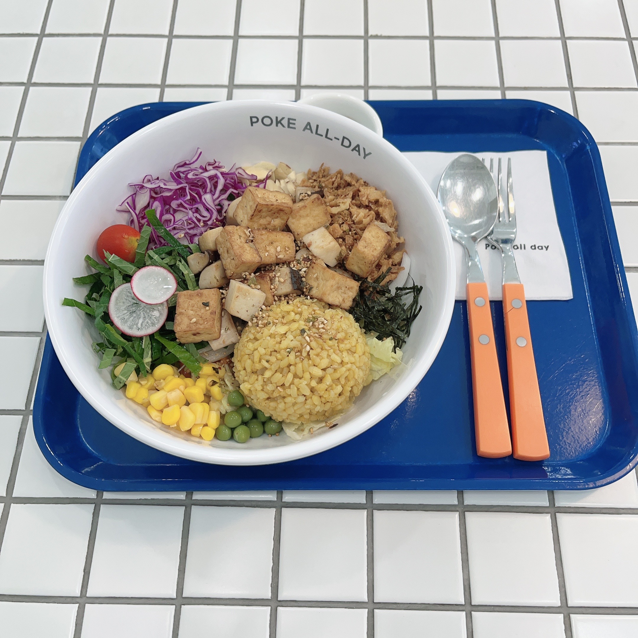 제가 주문한 메뉴는 비건(현미밥)에 두부 버섯 토핑을 추가한 포케였습니다. 비거니즘은 아니지만 실천할 수 있다면 육류 섭취를 조금씩 줄이고 있는 중이어서 닭가슴살이나 연어 대신 두부 버섯을 선택하였습니다. 메뉴 선택 시 좋아하는 취향에 따라서 커스텀을 할 수 있더라구요. 저는 이번에 처음으로 포케올데이에 방문해서 일단 가장 기본적으로 세팅되어 있는 메뉴로 주문했는데, 다음번에는 토핑이랑 소스도 다른 걸로 먹어보려고 합니다.