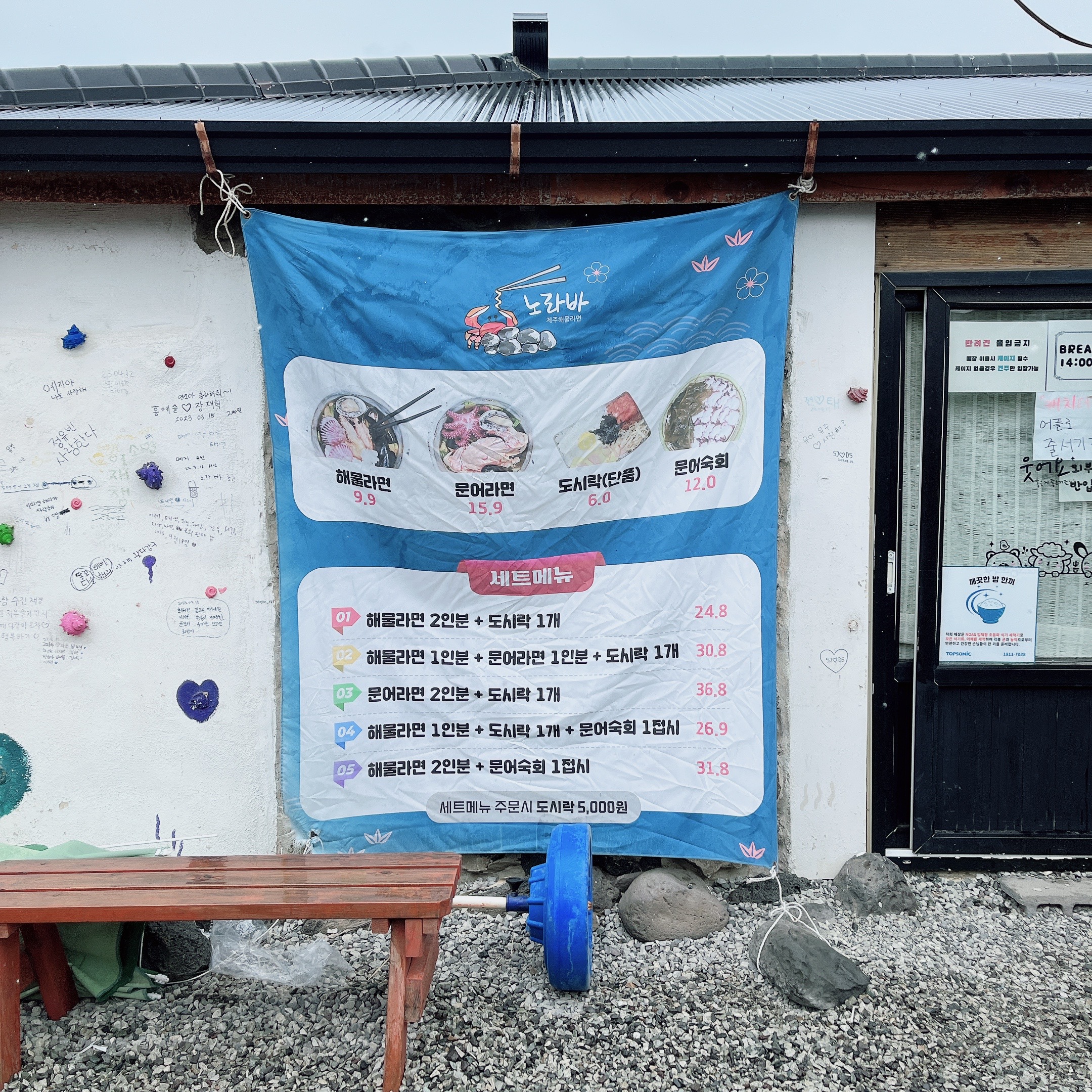 사실 제주도에 가면 꼭 방문하는 라면집이 있는데요, 하필이면 라면을 먹으러 간 날 비가 와서 단골 라면집이 문을 닫았지 뭐예요. 그래서 급하게 근처에 해물라면 집을 찾아서 가게 된 곳이 노라바입니다.