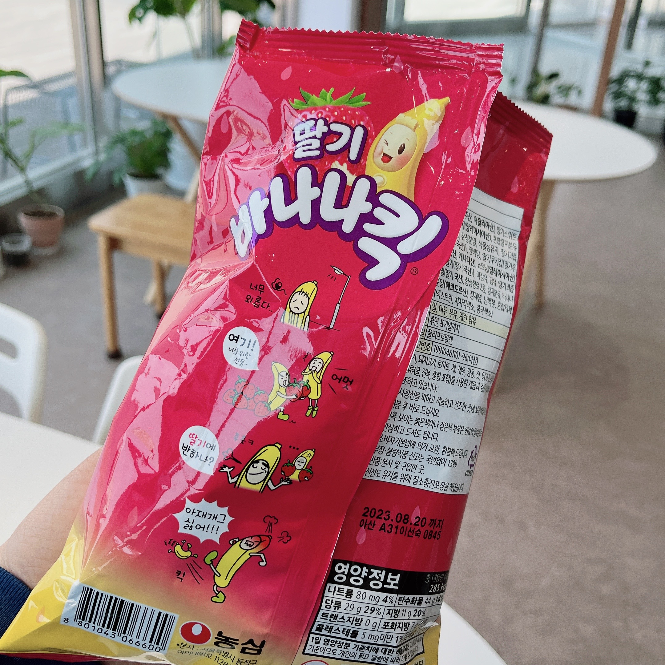 부드러운 바나나킥 과자에 새콤 달콤한 딸기의 맛과 향을 더했다니 그냥 지나칠 수가 없어서 당장 구매를 했습니다.