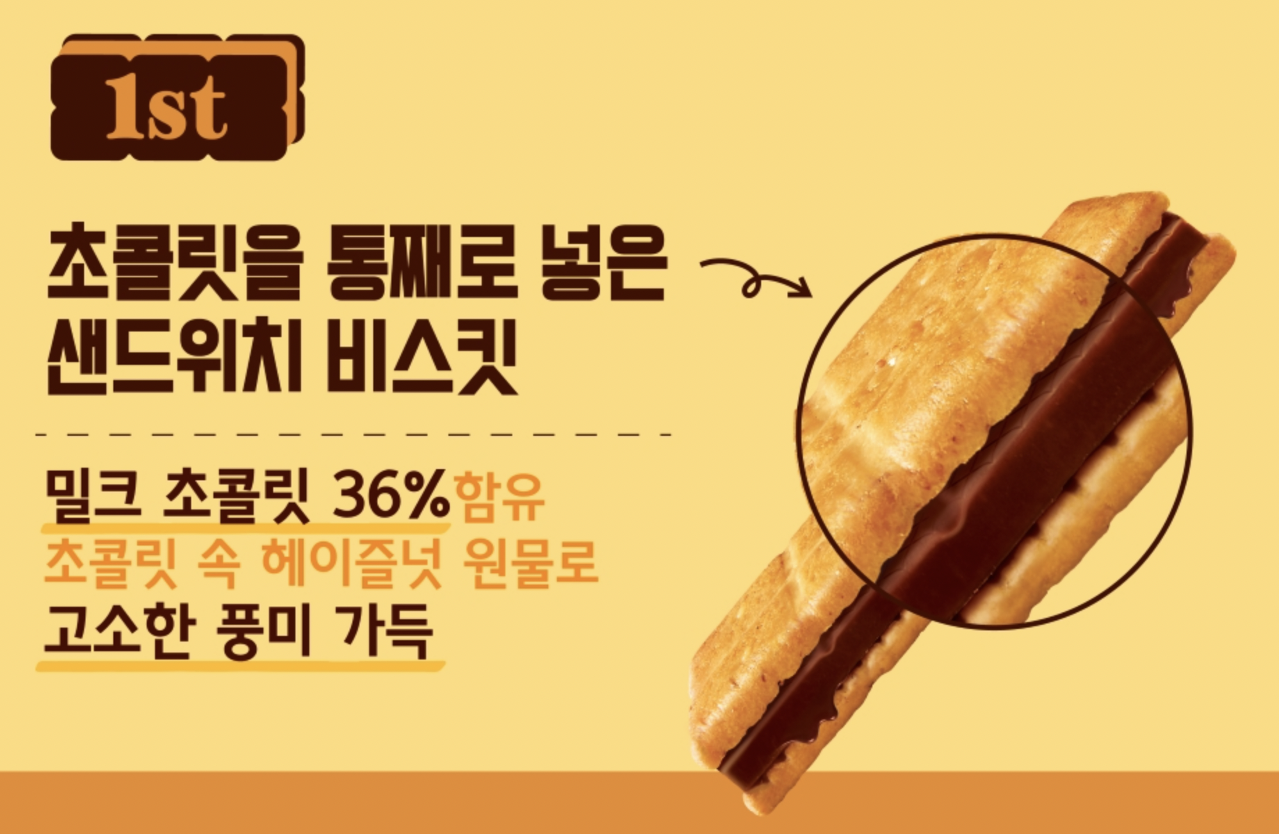 제품 소개 페이지랑 정말 똑같죠? 헤이즐넛 원물이 들어있는 초콜릿이 비스킷 사이에 꽉차게 들어있어서 바삭바삭 비스킷 식감과 꾸덕꾸덕한 초코 식감이 같이 만나니 완전 맛있었어요! 친구랑 같이 하나씩 나눠 먹었는데 5개 밖에 없는게 너무 아쉬웠어요ㅠㅠ