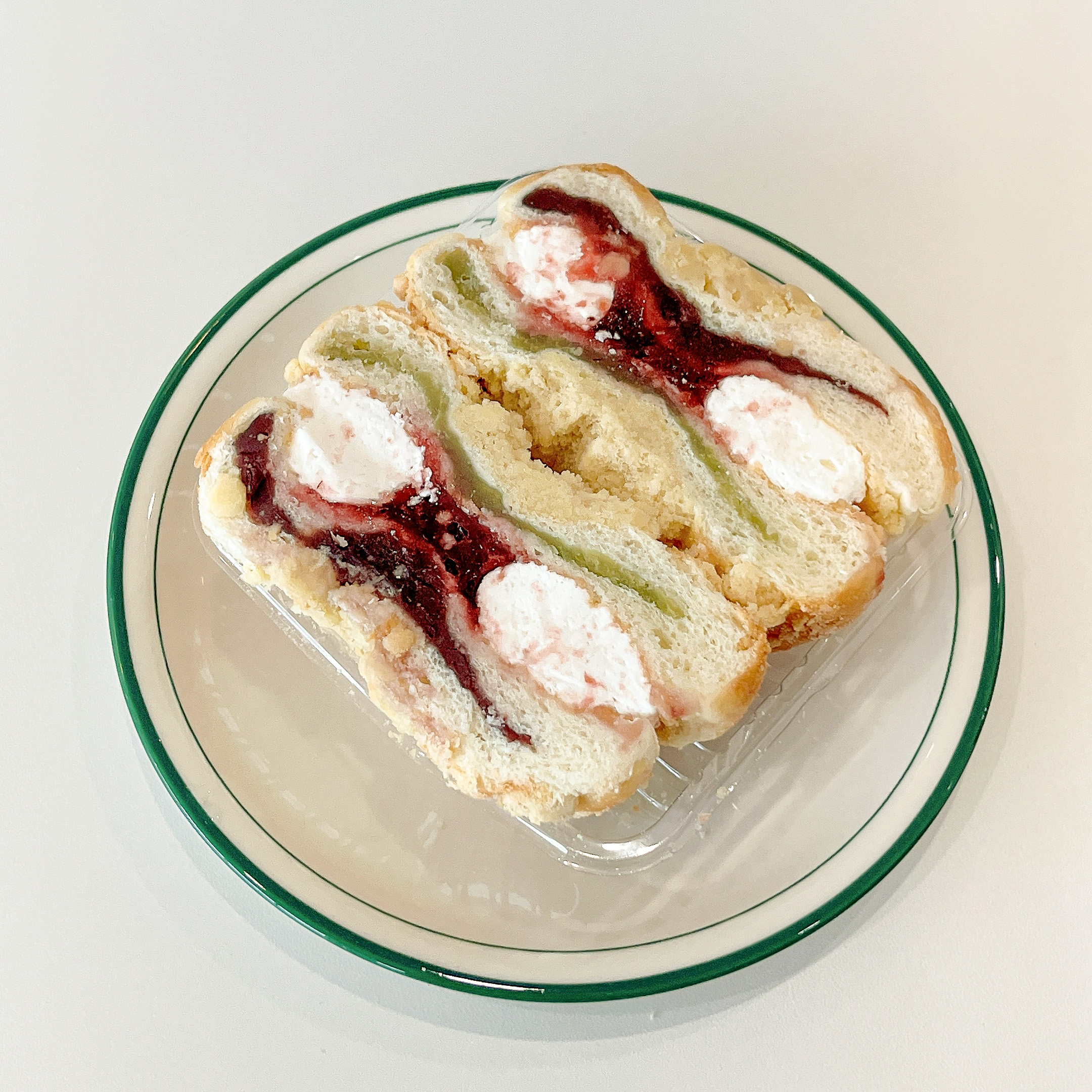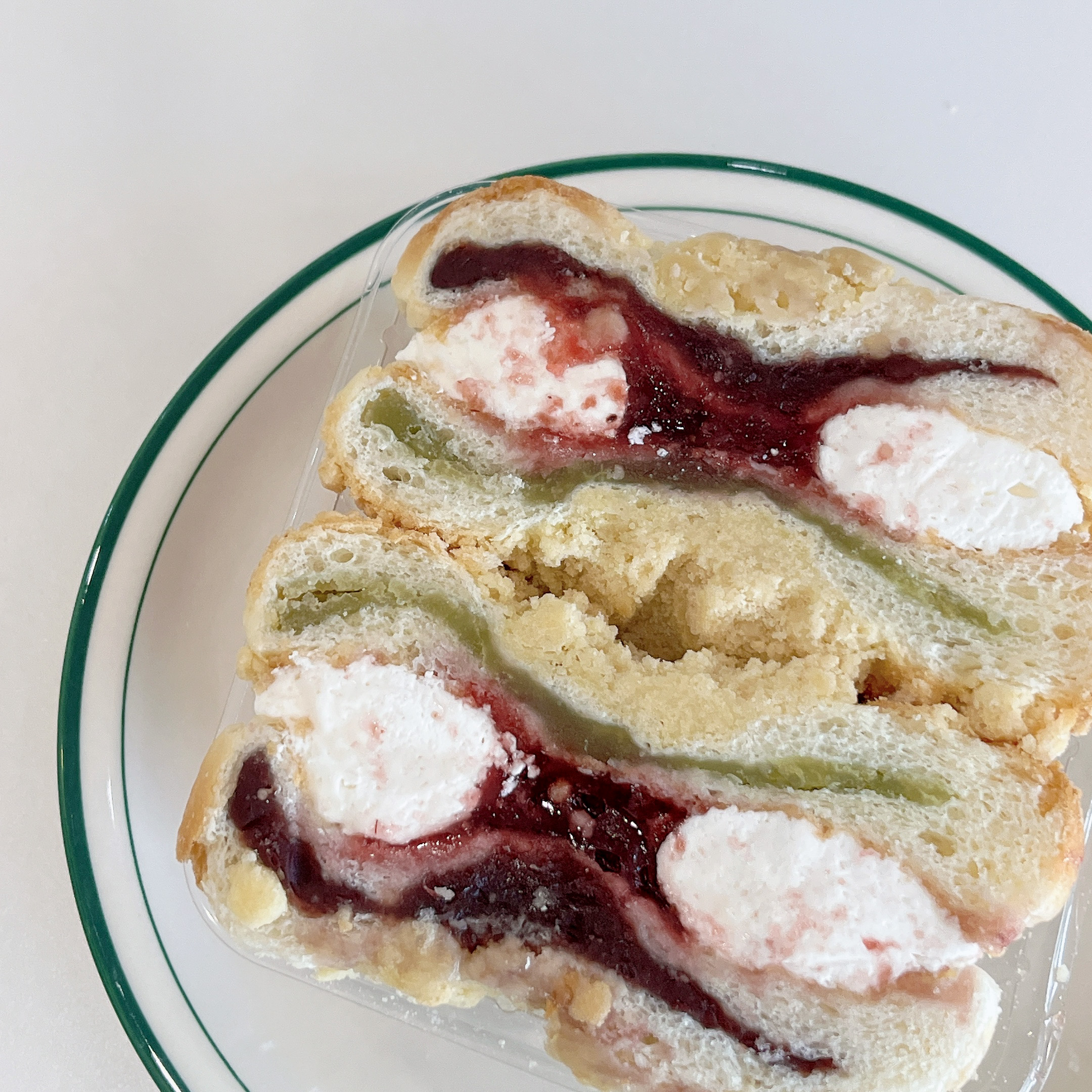 고대 딸기잼 맘모스빵은 24시간 이상 저온 숙성 반죽으로 만든 빵 위에 소보로를 토핑해 한층 부드러운 식감과 고소한 맛이 특징이라고 하는데요! 포장을 뜯으면 두쪽으로 갈라서 포장된 맘모스빵이 먹음직스럽게 느껴졌어요. 완두 앙금과 통단팥 앙금이 듬뿍 들어있고, 버터크림과 딸기잼이 빵과 빵 사이에 들어있어 우리가 흔히 아는 맘모스빵 다운 모습을 자랑하고 있었어요.