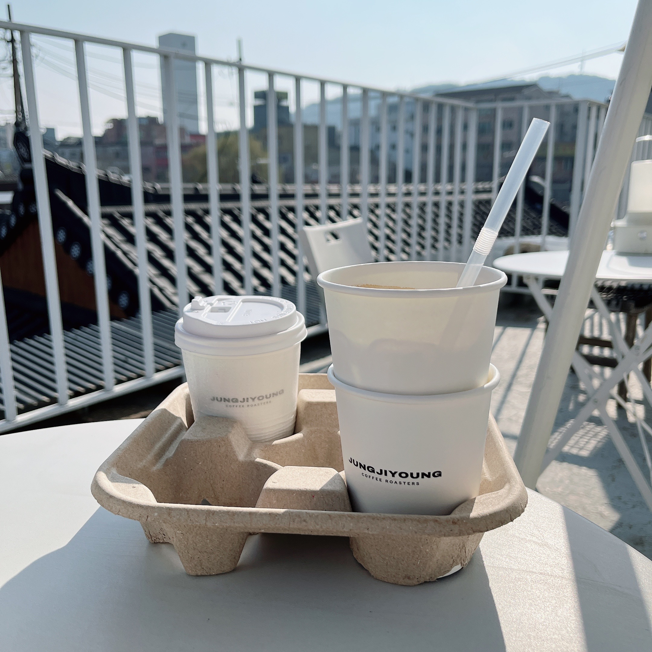 실내 공간도 예뻤지만 날씨가 좋으니 옥상에도 잠깐 올라가봤습니다. 사실 아직 바람이 좀 차가워서 분위기만 살짝 느끼다가 다시 실내로 들어왔어요. 날이 조금 더 따뜻해지면 야외에서 햇볕 쬐면서 시원한 아이스커피를 마시면 너무 좋을 것 같더라고요.